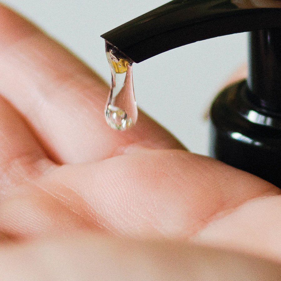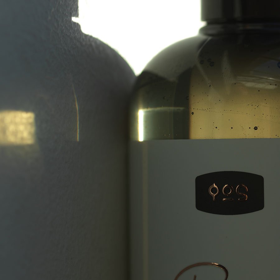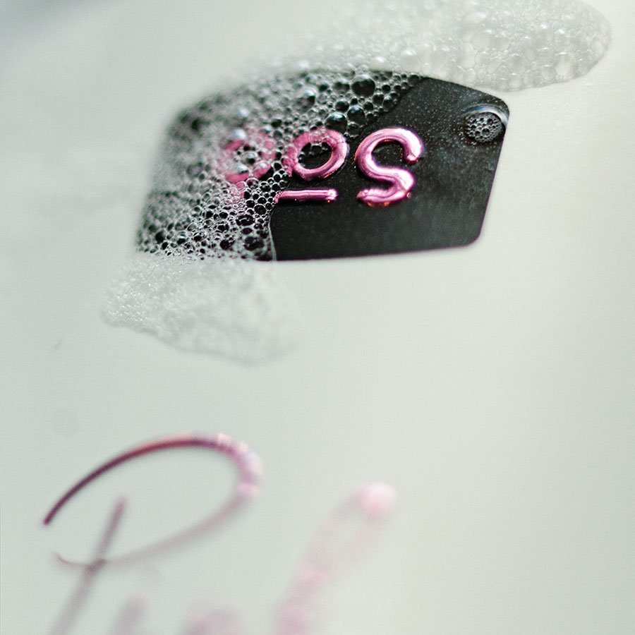 Το μπουκάλι στο οποίο συσκευάστηκαν ήταν μαύρο ημιδιαφανές, οπότε η ετικέτα επιλέχθηκε να είναι λευκό για να δημιουργεί έντονη αντίθεση. Το λογότυπο τοποθετήθηκε ψηλά στο κέντρο και ακριβώς από κάτω με μία ρομαντική καλλιγραφική γραμματοσειρά, αναφερόταν ο τύπος του υγροσάπουνου.