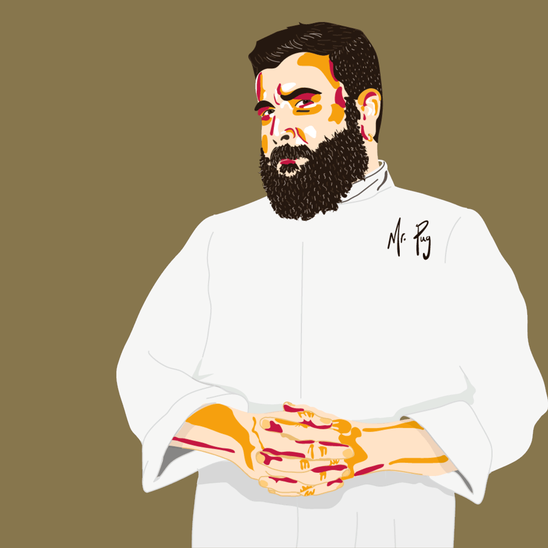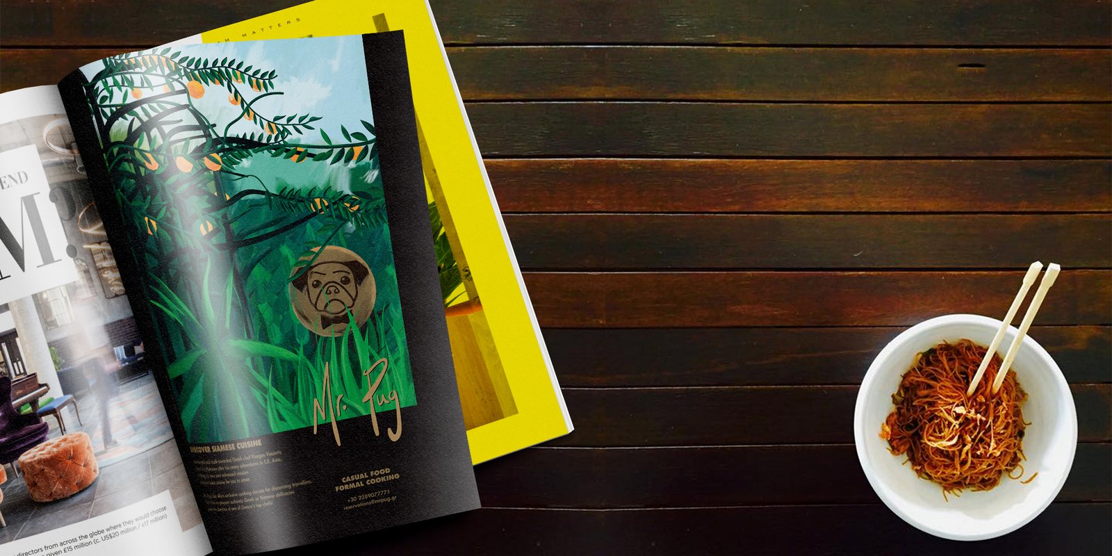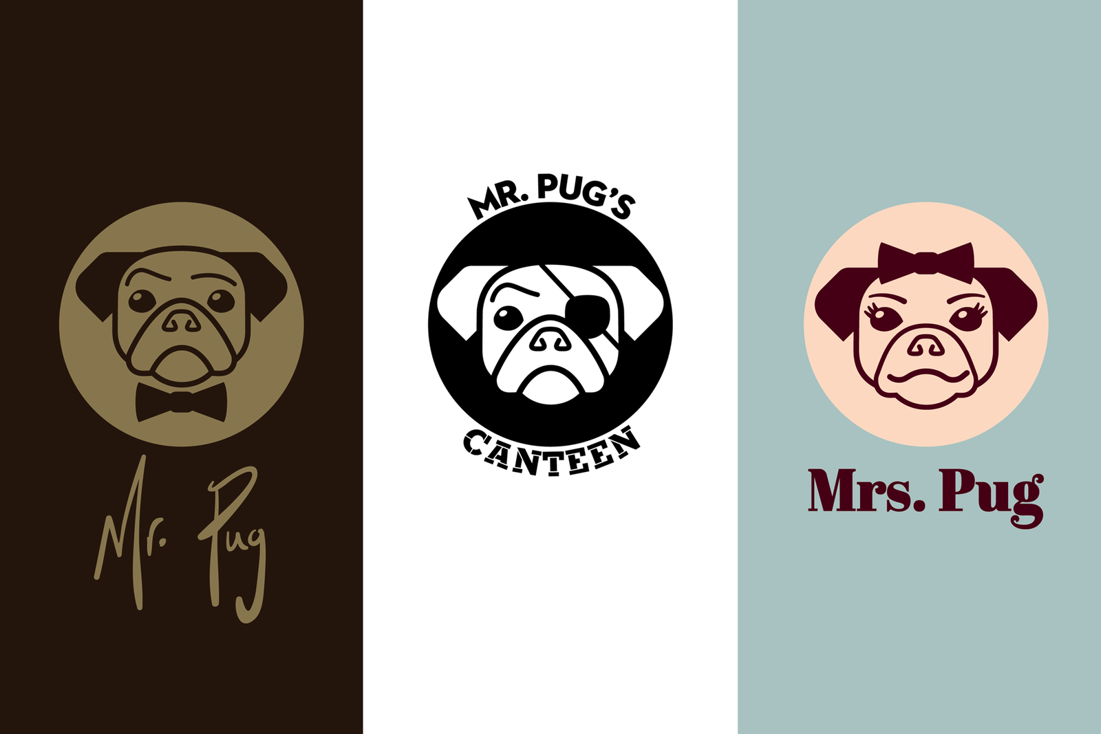 Όταν το Mr. Pug έκανε το ντεμπούτο του στα φημισμένα σοκάκια της Μυκόνου ως ένα εναλλακτικό γαστρονομικό εστιατόριο σιαμέζικης κουζίνας δημιουργήσαμε μαζί τον πρωταγωνιστή κύριο Pug, ο οποίος φιγουράρει εμβληματικά στο λογότυπο του εστιατορίου. Ασφαλώς πρόκειται για το δημοφιλές σκυλάκι της φυλής pug το οποίο σχεδιάστηκε γραμμικά και έβαλε το παπιγιόν του για να ακολουθήσει το formal dress code που αντιστοιχεί σε ένα εστιατόριο. Για τη γραφή επιλέχθηκε μία γραμματοσειρά με ελεύθερη σχεδόν χειρόγραφη μορφή ενώ για το χρωματισμό προτιμήσαμε μία διχρωμία σε γήινους καφέ τόνους και έντονη αντίθεση.