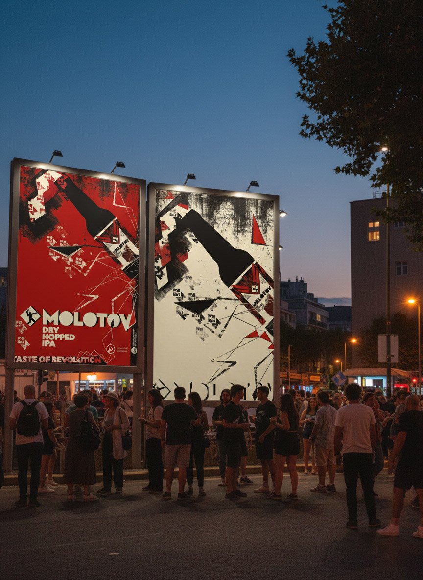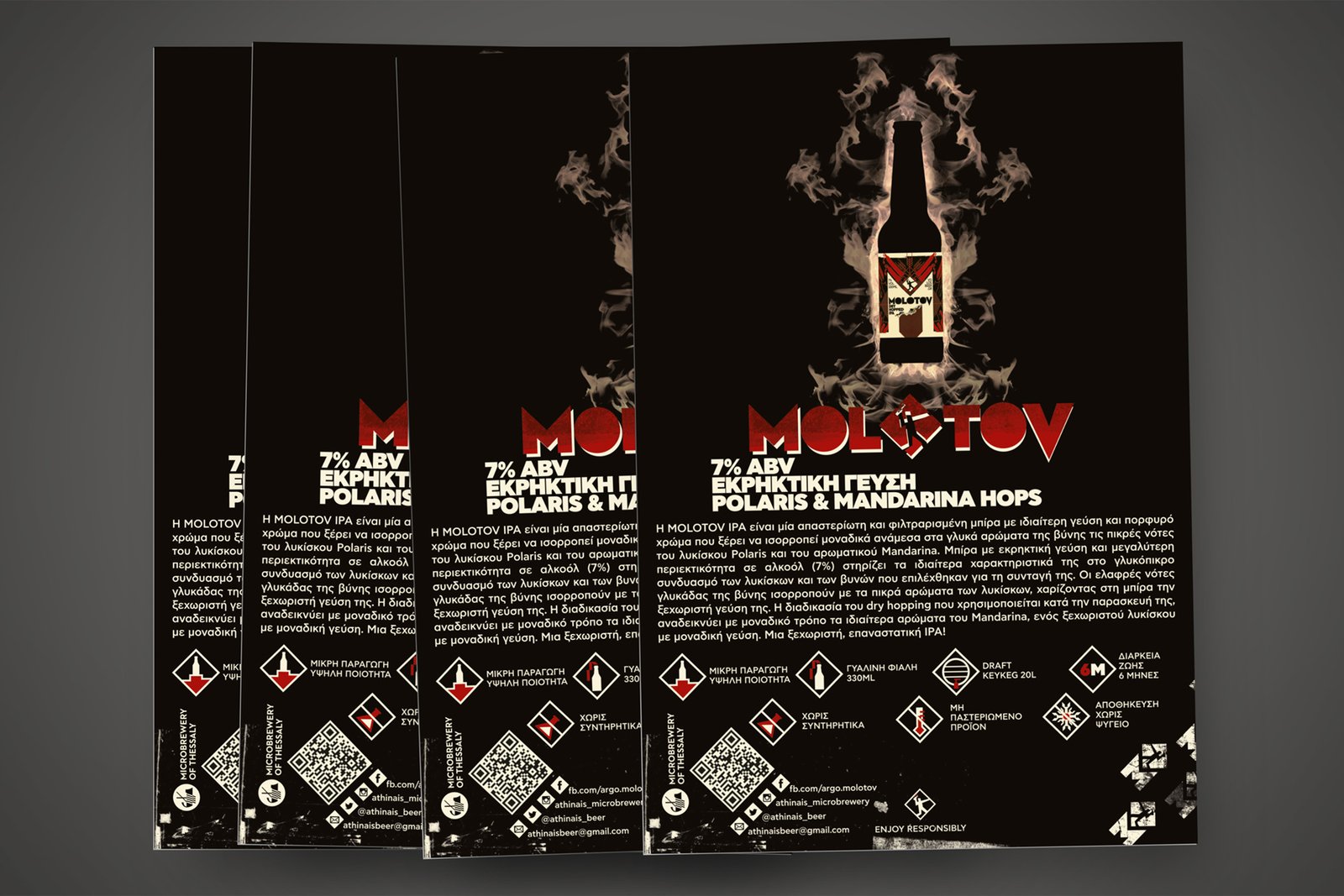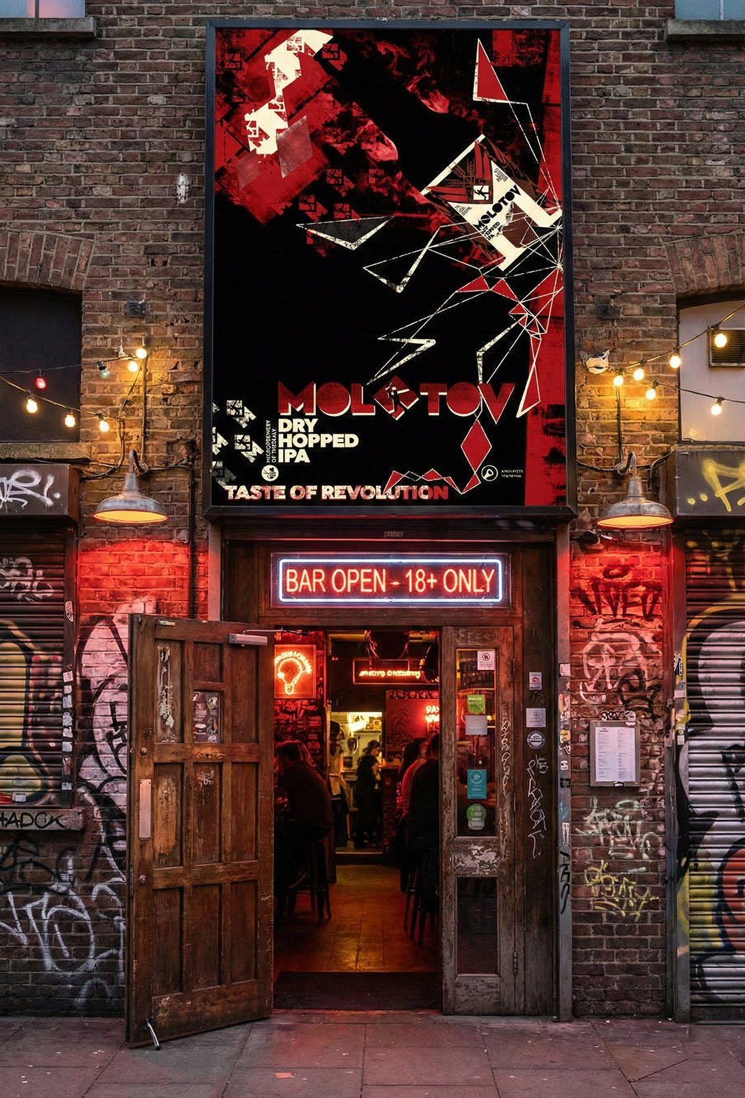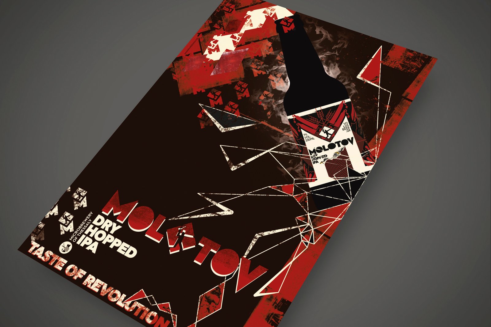 Ο σχεδιασμός της Molotov IPA αντλεί έμπνευση από τη γλώσσα της εξέγερσης και την ωμή ενέργεια της νεανικής κουλτούρας. Η μπίρα παρουσιάζεται μέσα από μια εικαστική σύνθεση που θυμίζει αφίσα δρόμου: δυναμική παλέτα, θραύσεις, στιβαρή τυπογραφία και ένα εικονίδιο-σχόλιο για το θάρρος και τη δράση. Η συνολική αισθητική μετατρέπει την εμπειρία της μπίρας σε κάλεσμα για έκφραση, δημιουργία και ανατροπή — με μια δόση παιχνιδιάρικης έντασης που μιλάει άμεσα στο νεανικό κοινό.