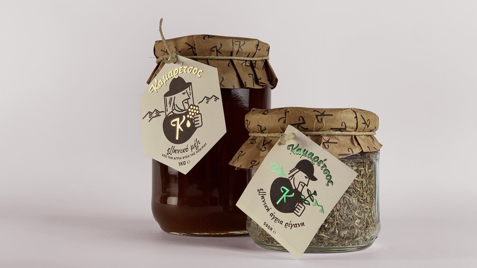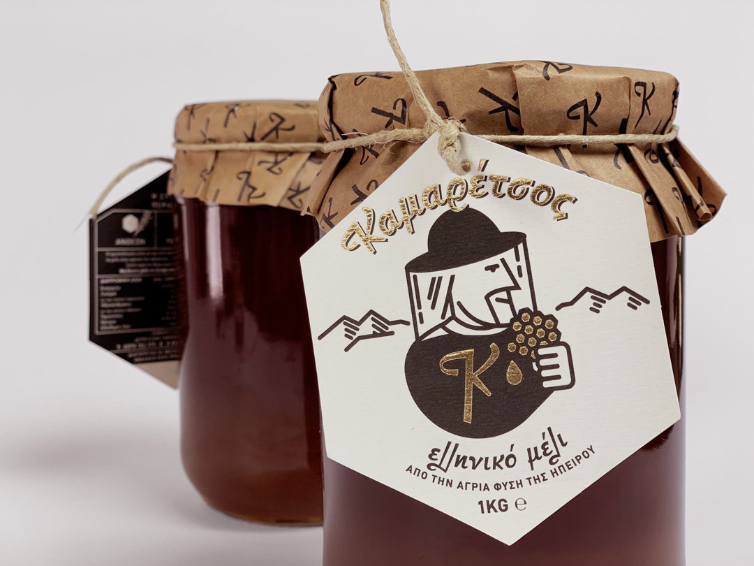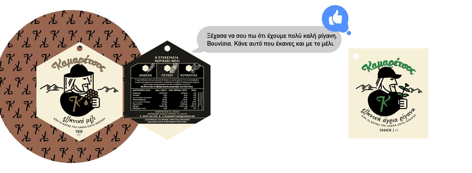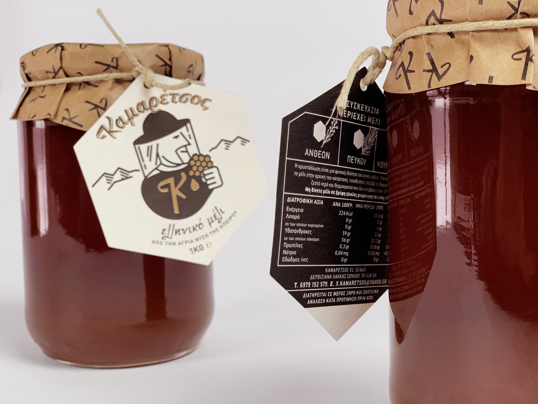 Έτσι, προέκυψε μια συσκευασία που άθελά της δημιούργησε έναν ήρωα που ανταποκρίνεται και προσαρμόζεται σε κάθε περίπτωση στις ανάγκες της εποχής. Ο Καμαρέτσος, αυτή η ευγενής, καλοσυνάτη φιγούρα που κρύβεται πίσω από το μοναδικό αυτό όνομα, πρωταγωνιστεί -στην απλή γραφιστική της εκδοχή- στη σήμανση της μικρής επιχείρησης από τις αρχές της ύπαρξής της. Για τις ανάγκες της νέας δραστηριότητας, ο αγαπητός Καμαρέτσος φόρεσε την ειδική ενδυμασία της συλλογής μελιού και περήφανα δοκιμάζει τα αποτελέσματα της αποκομιδής του. Και φυσικά τι πιο ιδανικό να αποτυπωθούν όλα αυτά σε ένα “κομμάτι” κηρήθρας.