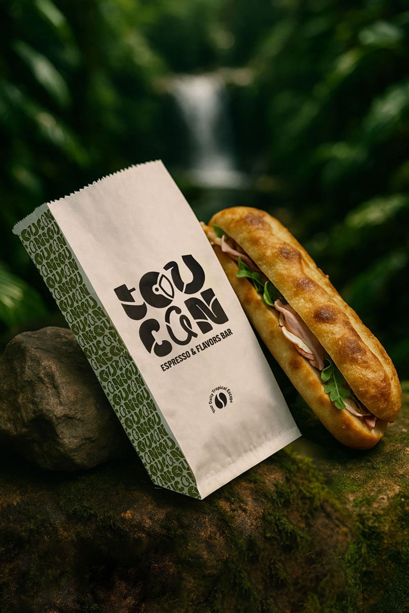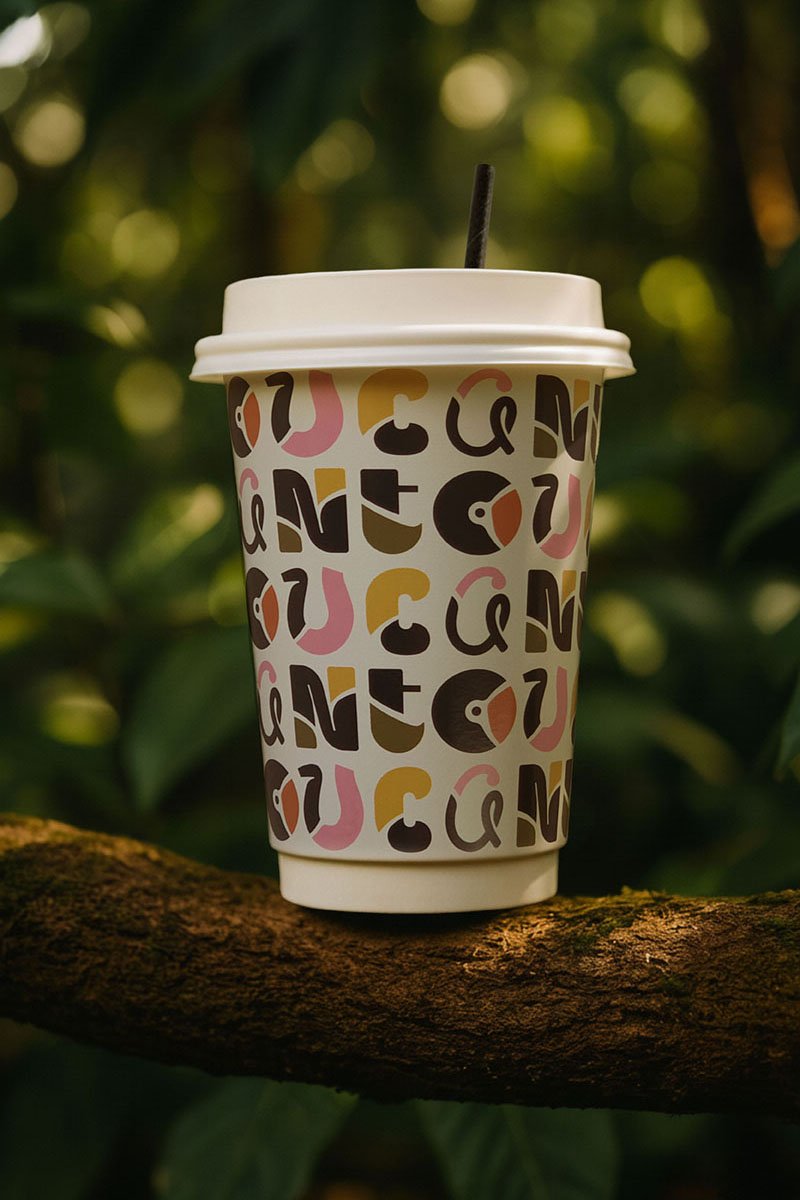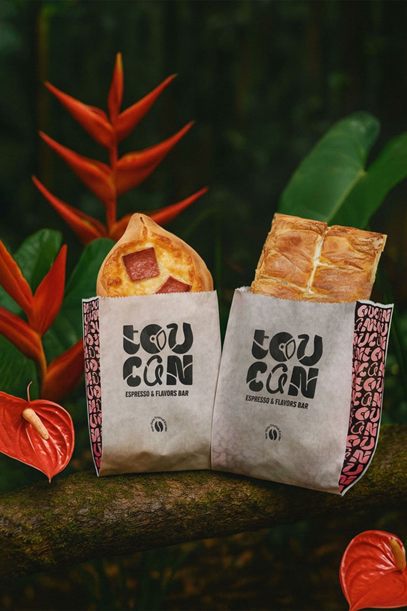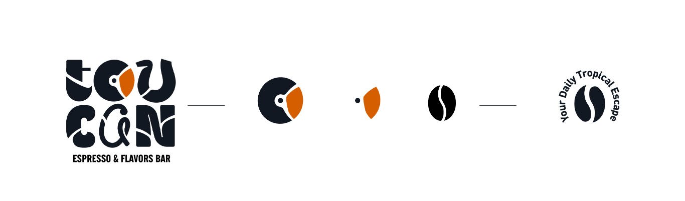 Ξεκινώντας από την λογοτύπηση εμπνευστήκαμε μία προσέγγιση που θα ενσωμάτωνε το σήμα του toucan στην τυπογραφία. Διατηρώντας τα εξωτικά χρώματα και τις γραμμές του εντυπωσιακού πουλιού, δημιουργήσαμε μία οργανική τυπογραφία με πολύχρωμα μοτίβα, η οποία στη συνέχεια αποτέλεσε τη βάση για ολόκληρη την εταιρική ταυτότητα σε διάφορους συνδυασμούς κοσμώντας ποτήρια, συσκευασίες και σακούλες του καταστήματος.